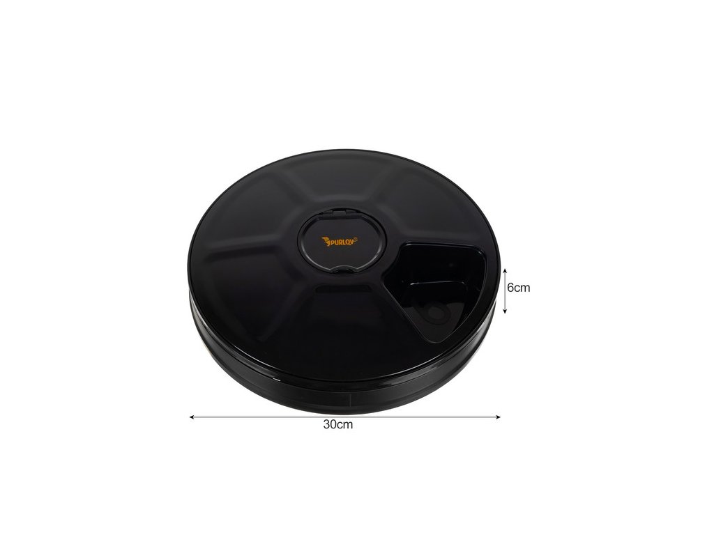 - 6 KOMOR – miska má 6 komor o objemu každé 150 ml. 5 je zakryto a jeden je otevřený. Systém časovaného otevírání při otáčení víka otevírá v určitou dobu jednu komoru s jídlem .