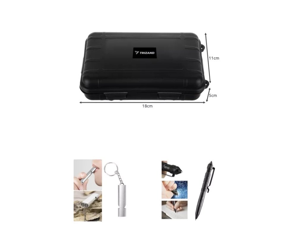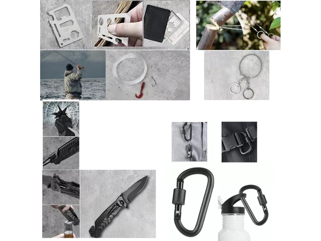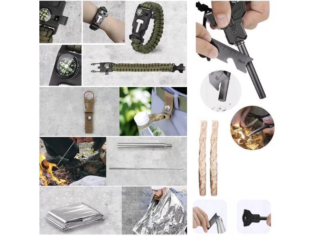 - 32 v 1 - sada obsahuje: strunová pila cca 60 cm dlouhá, zavírací nůž s pilou a řezačkou struny , taktické pero, karta přežití 11 v 1, zapalovač ohně s hořčíkovou tyčí a tác na sekání s cm stupnicí a otvírákem na láhve, svítilna - napájená AA baterií (baterie nejsou součástí balení), tepelná přikrývka 130x210 cm, uzamykatelná úložný kontejner, držák na láhev na opasek, paracordový pásek - cca 350 cm paracordu s kompasem, píšťalkou a podpalovačem - vše ve formě pásku, silikonová návnada 2 ks + vlasec + 2 háčky, náležitosti - lžíce s vidličkou a otvírákem na láhve + nůž, skládací plamenec, zapalovací struna 2 ks, karabina 2 ks Jedná se o velmi velkou sadu, která vám umožní přežít ve velmi obtížných podmínkách.